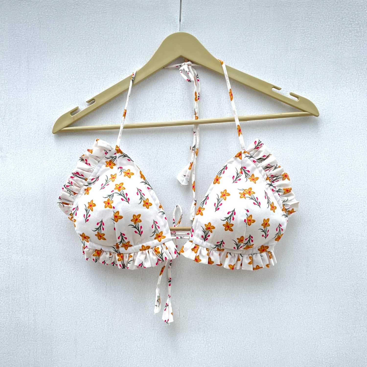 The White & Yellow Butti Frill Cotton Bralette is a fresh and feminine piece that combines comfort with vibrant style. Made from soft, breathable cotton, it features delicate butti prints in a cheerful yellow. The playful frill detailing adds a charming touch, enhancing its elegant yet relaxed vibe.