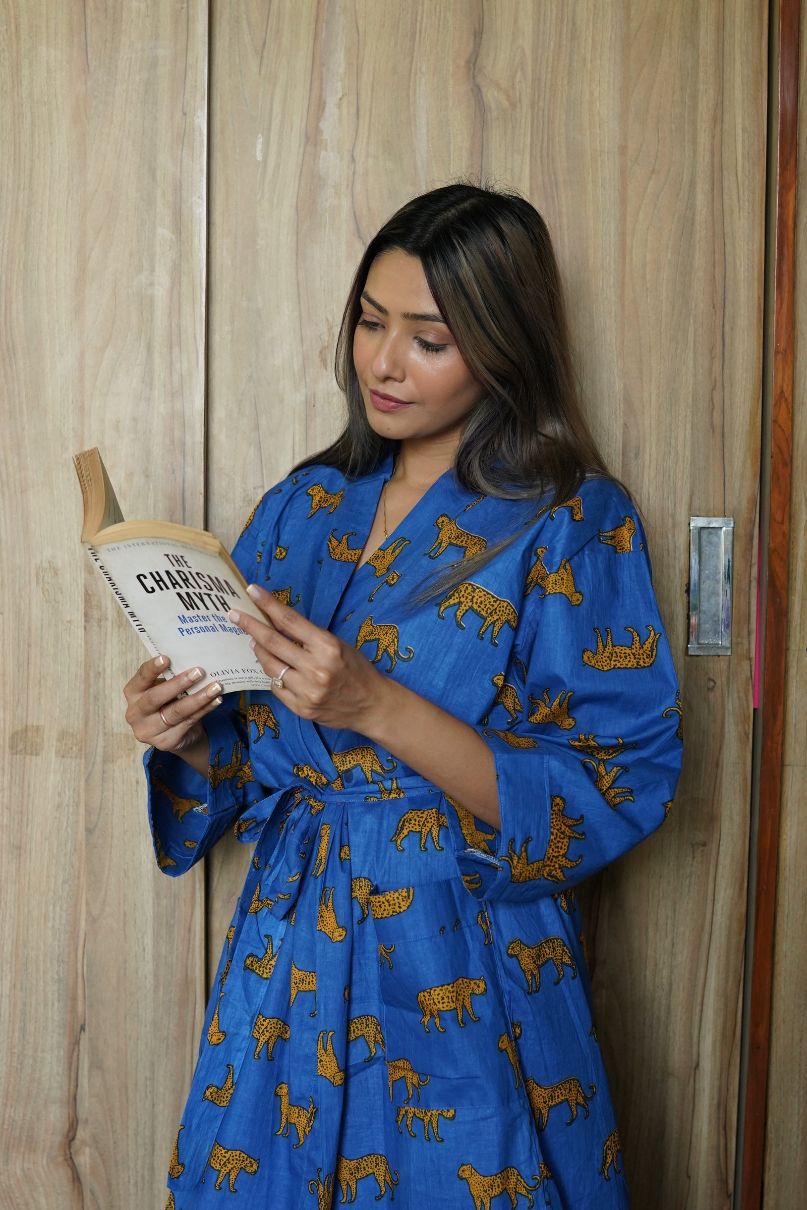 Embrace effortless luxury with our Wild And Free Robe — a lightweight, block-printed housecoat designed for ultimate comfort and style. Perfect for lounging at home, spa days, or as a chic cover-up at the beach or poolside. Crafted from 100% soft cotton cambric and printed with vibrant azo-free dyes, this robe features a flattering comfort fit, 3/4 sleeves, two handy front pockets, and a matching cotton belt for adjustable ease.