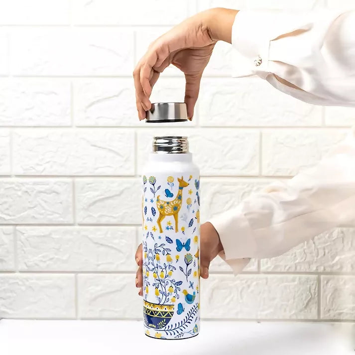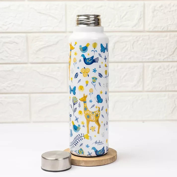 The Wild Grace Steel bottle showcases stunning botanical illustrations of deers, butterflies and florals, mimicing an enchanted forest landscape. This bottle is not just a beautiful addition to your drinkware collection but also durable as it is made with high quality 304 grade steel. No wonder this is the most preferred choice when it comes to beautiful yet thoughtful gifting.