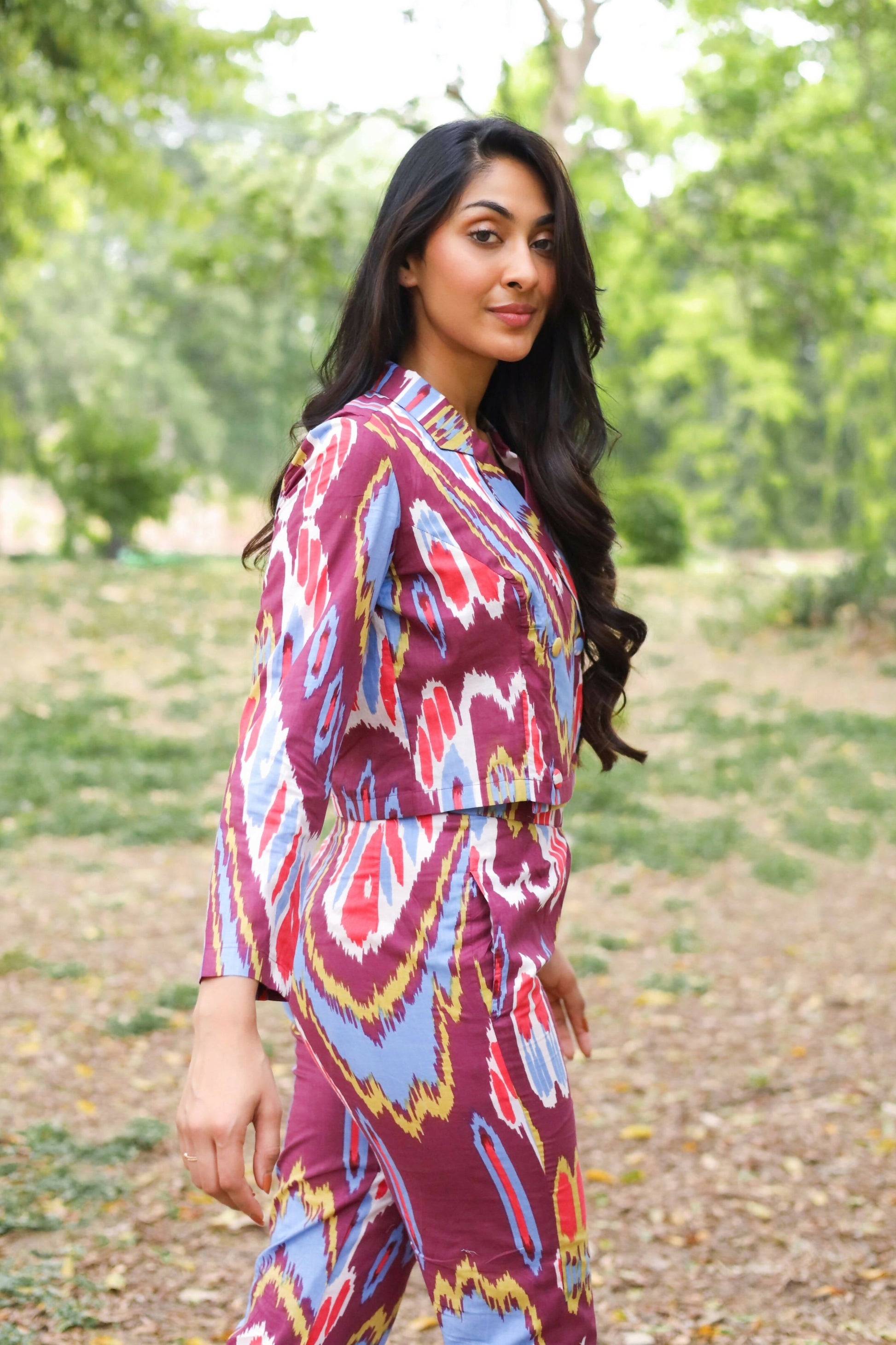 Wine Ikkat Cropped double breast blazer with full sleeves and pants.