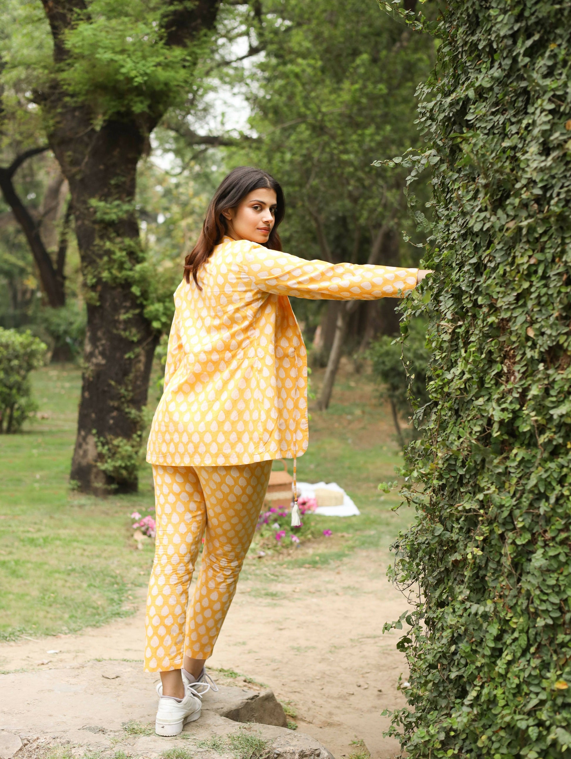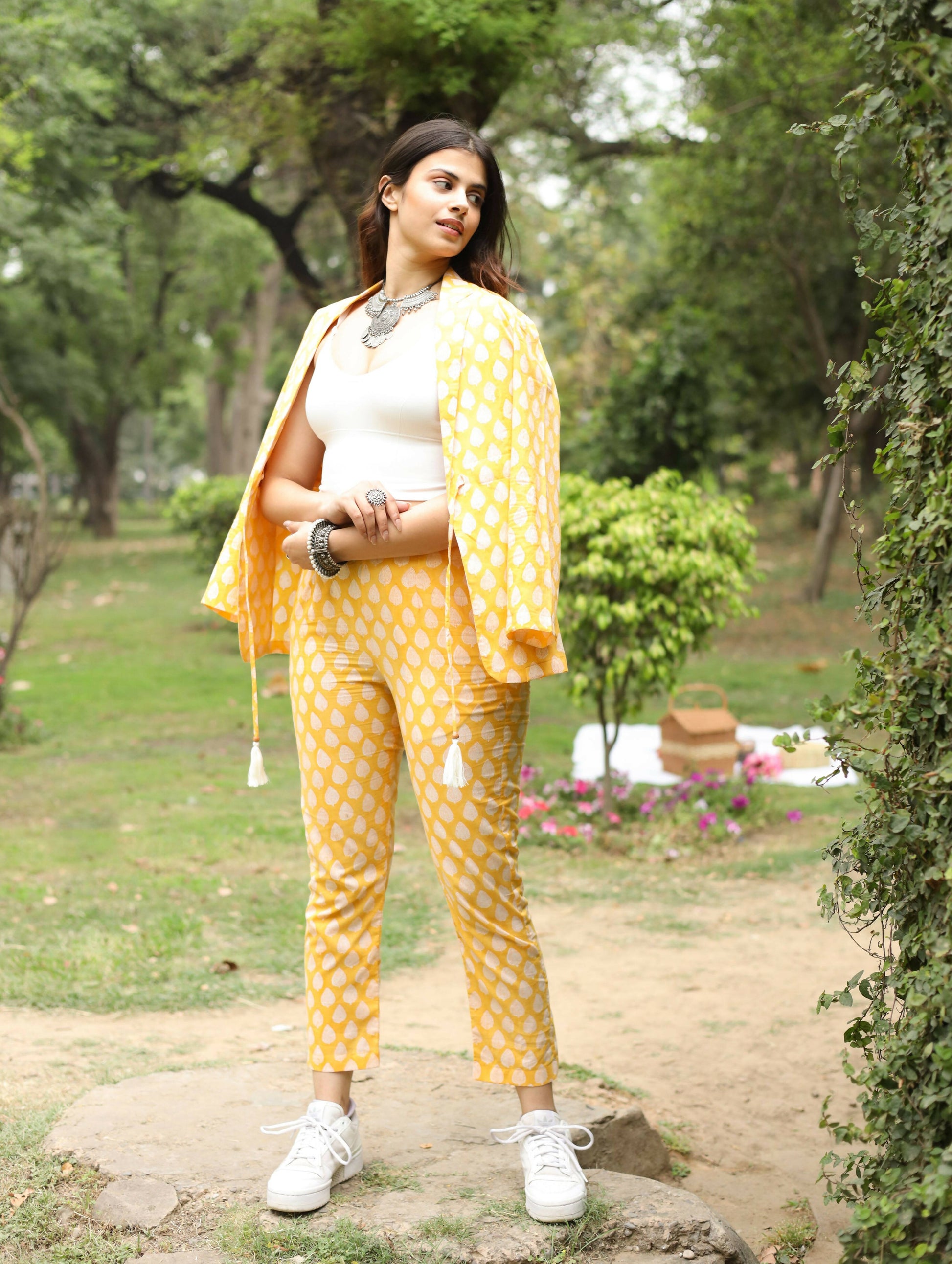 A bright yellow motif print made into a blazer set with the dori tie on the waist. Tie it to fit to your comfort or let it loose- this is sure to catch all the right attention.