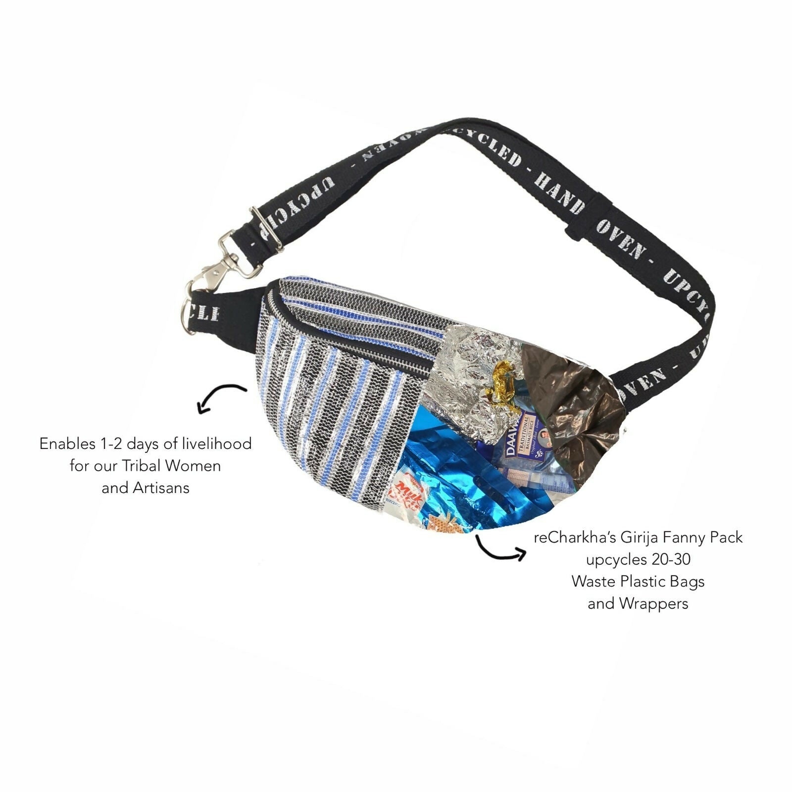 A Fanny Pack is one of the best utility accessories when we talk about bags. It comes in extremely handy while travelling or even in day to day life. This one from the Girija's collection is a special one with printed belts that proudly say, 'Upcycled-Handwoven'. We've added a zipper pocket at the back while also increasing the size of the fanny pack, so that you can put in all your essentials and are set for the day.Product Details: