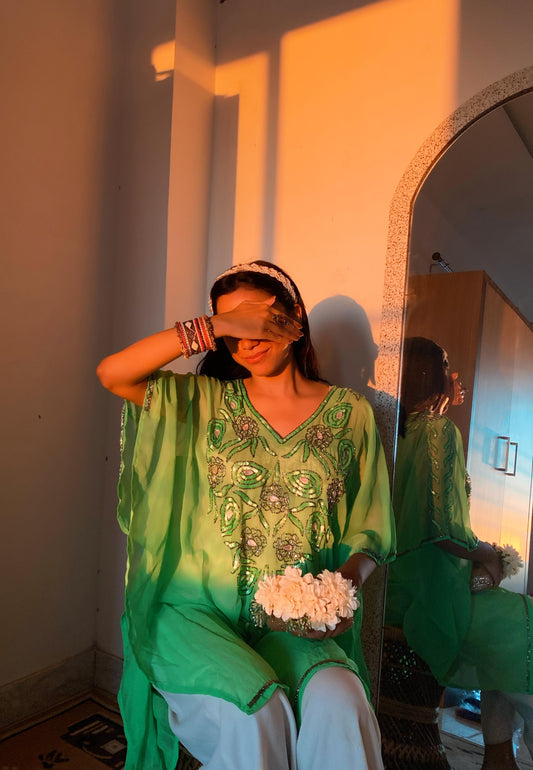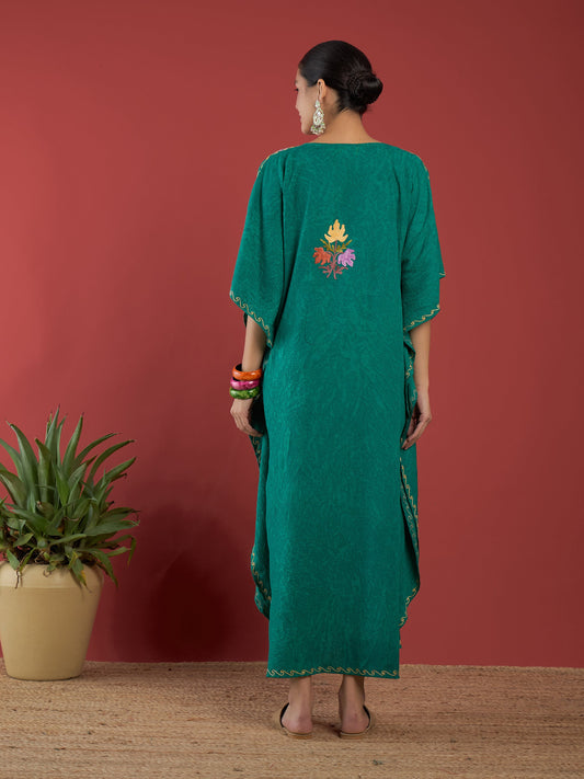 Pine Green Aari Embroidered Kashmiri Kaftan - Long