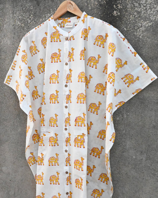 Marching Camel Hand Block Printed Cotton Midi Kaftan Shirt