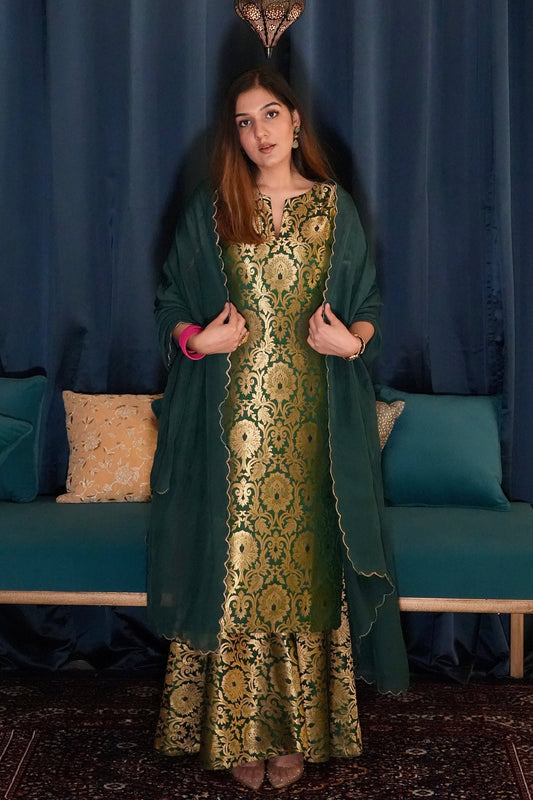 Meera Banarasi Silk Brocade Gharara Set - Dark Green