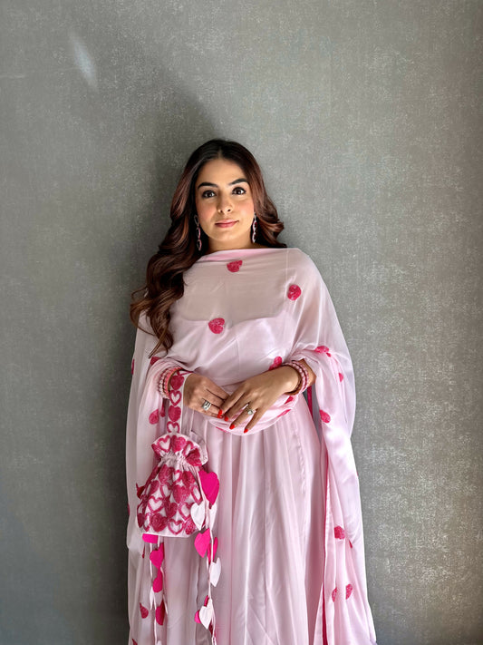 Pink Heart Embroidered Georgette Suit Set