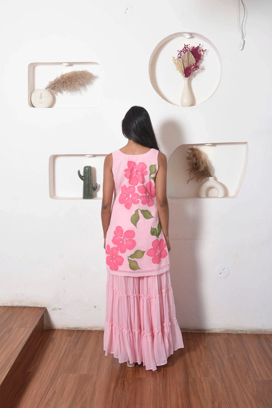 Handpainted Flora Georgette Sharara Set in Pink