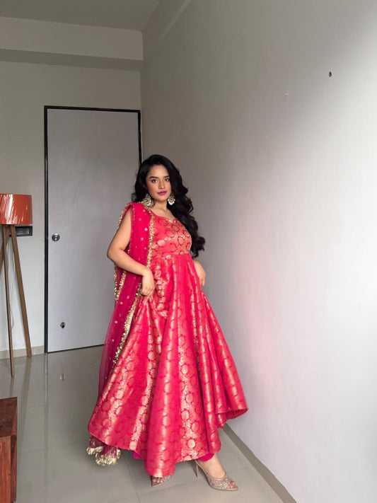 Mannat Red Brocade Golden Weave Anarkali Suit Set