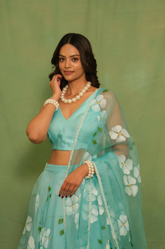 Dogwood Hand-Painted Lehenga in Blue