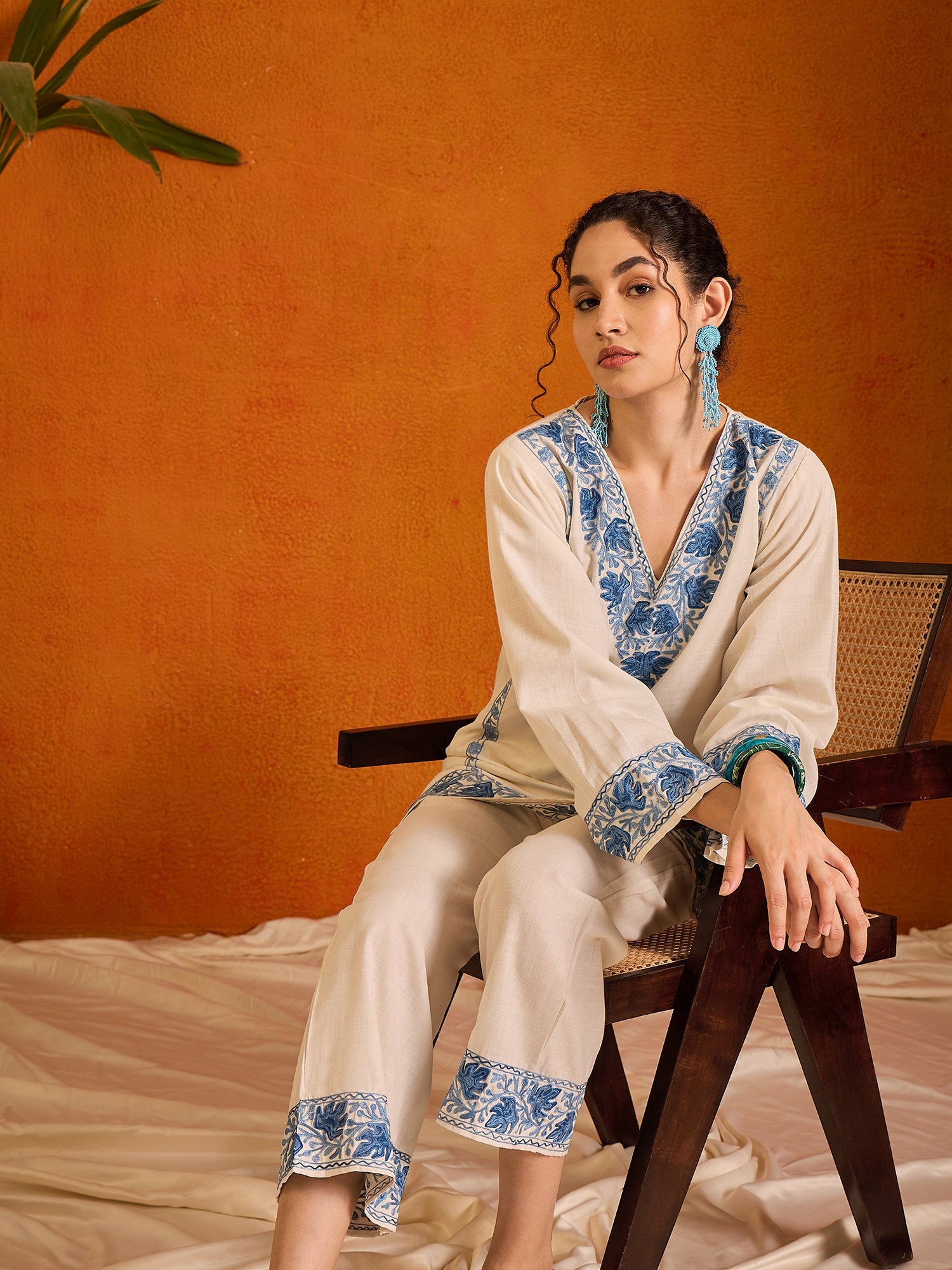 This Alia aari embroidered co-ord kurta set makes a fashion statement and turns others heads. The kurta is set in white with blue embroidery floral motifs. The trousers also have aari embroidery at the bottom. The elegant and intricate Kashmiri embroidery showcases the rich heritage of the traditional craft.The handcrafted kurta features a V-neck with a meticulous, chinar leaves Aari embroidery.