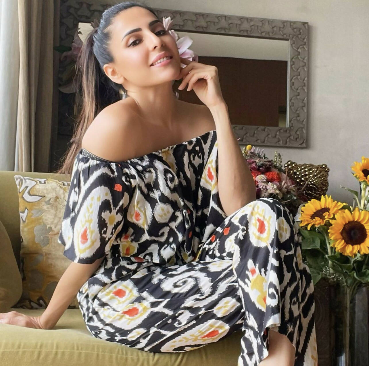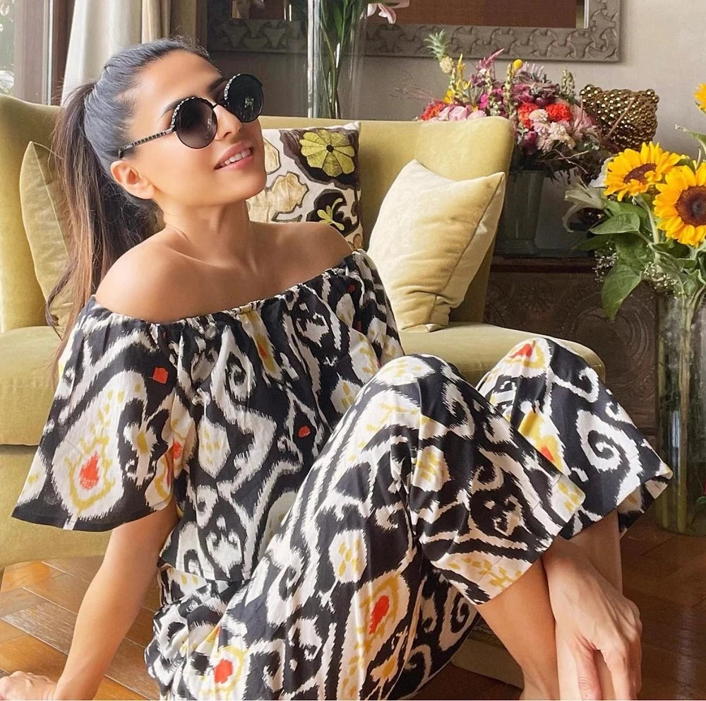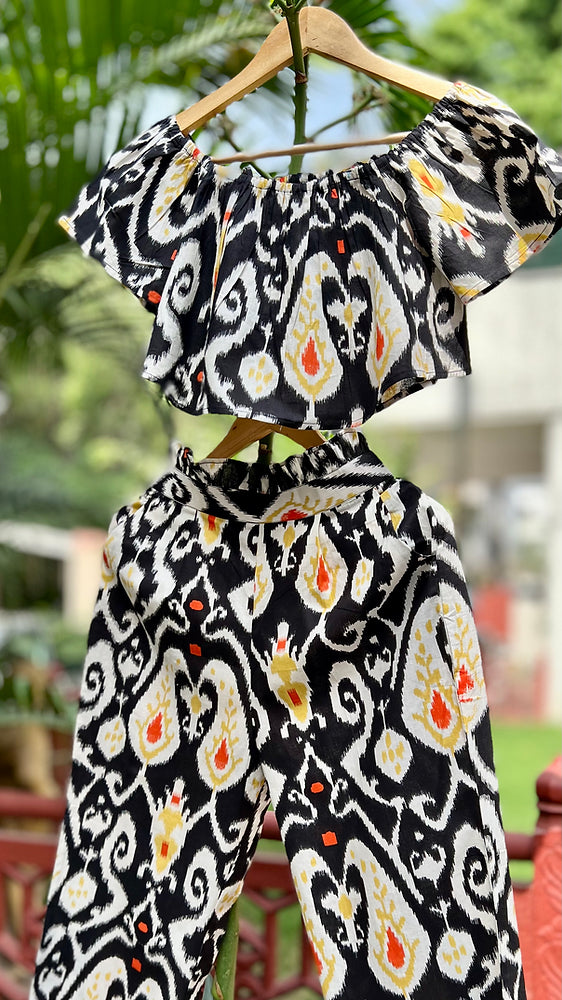 A Black Ikat Print Offshoulder Crop Top Set with High Waist Pants. An effortless style for your summer wear that gives out the perfect vacation vibe.