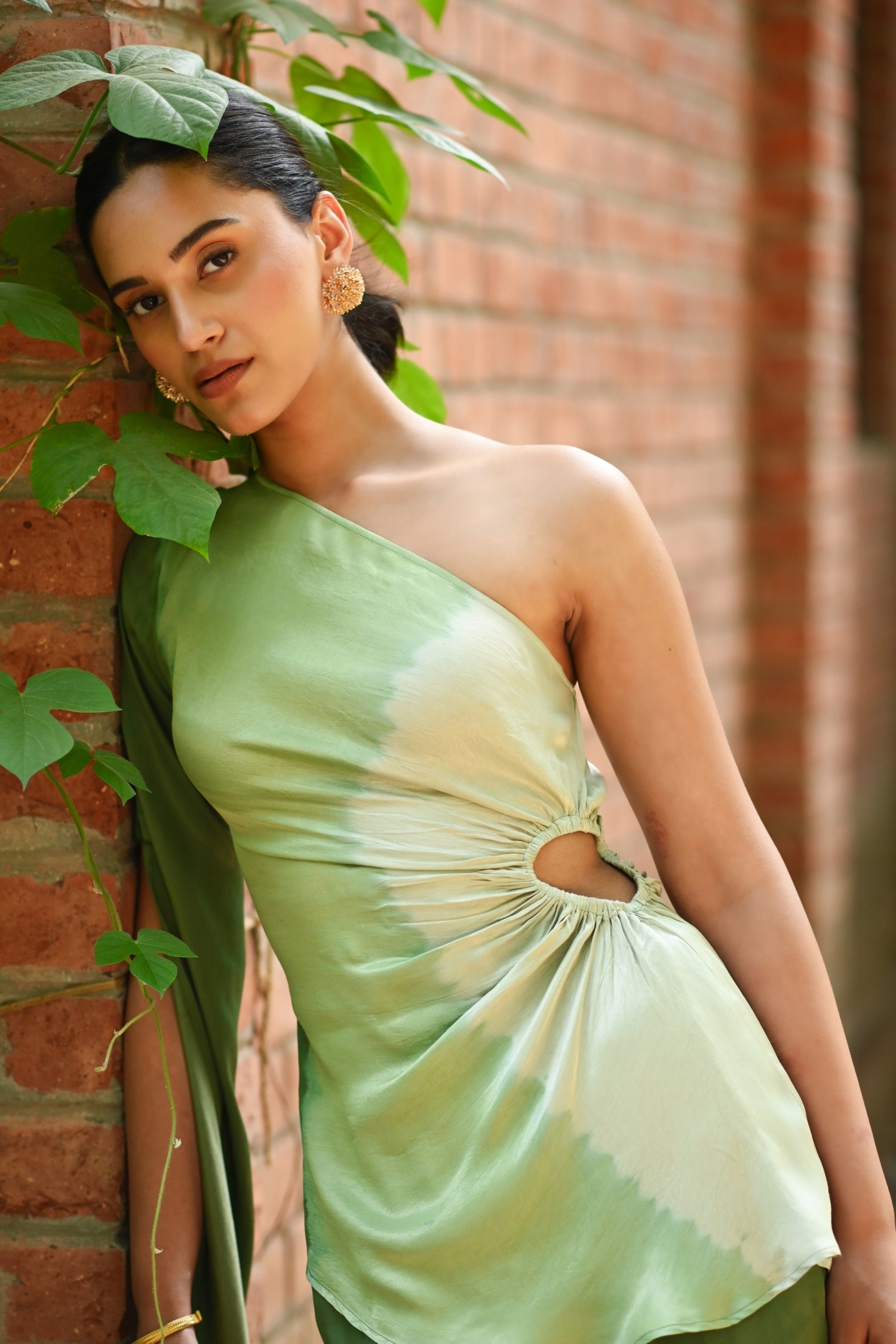 This stunning ensemble featuring a one-shoulder top and bell-bottom pants, both adorned in an enchanting ombre of lush greens. The top boasts elegant bell sleeves with slits, adding a touch of drama to your look.