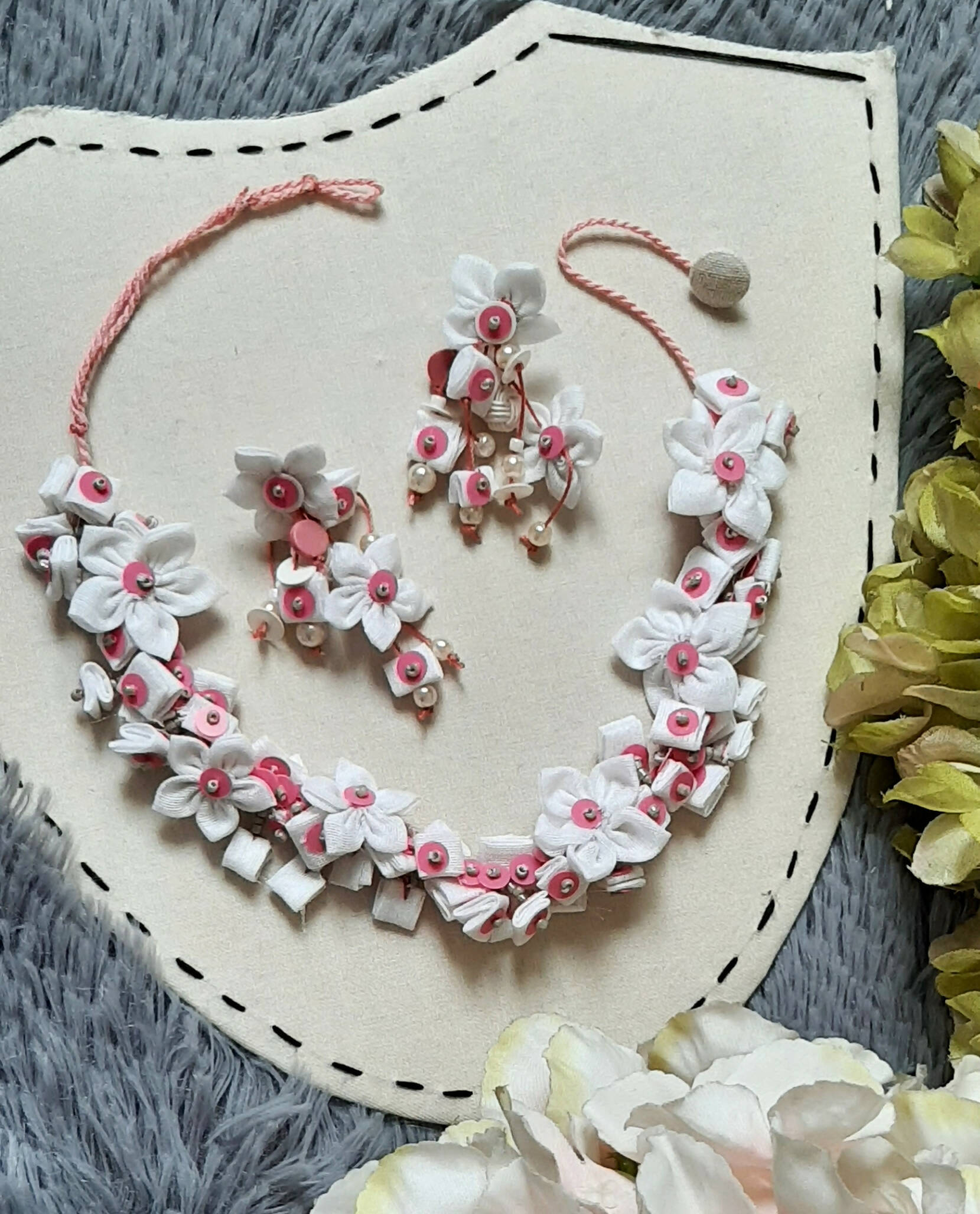 Handcrafted with fabric and beads these pair of earrings along with necklace are great statement piece and perfect for gifting or own use. It can be teamed with most of the themes.