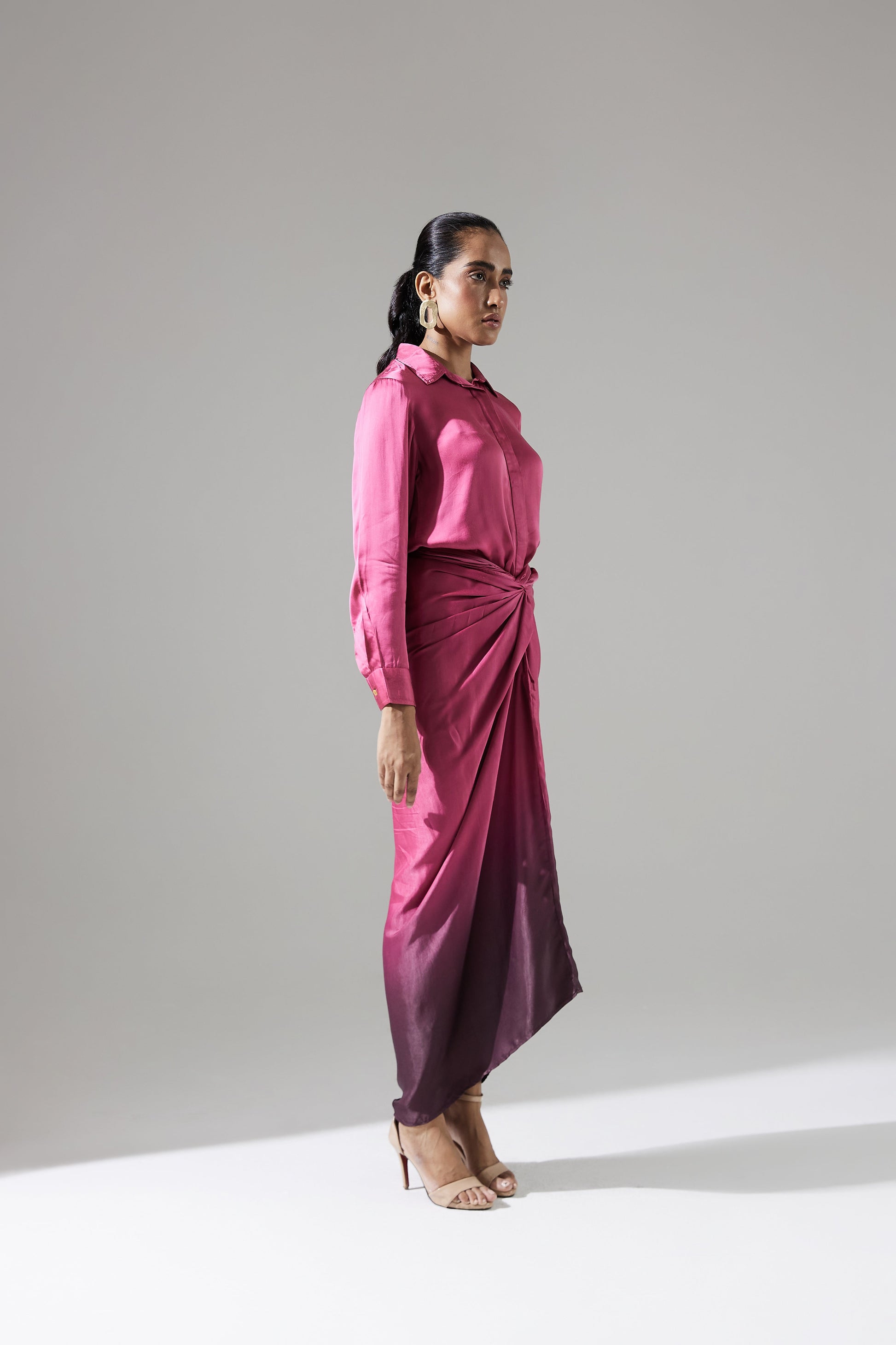 Embrace vibrant summer style with the stunning Freda co-ord set. The full-sleeves shirt pairs beautifully with a wrap-around skirt that hugs your body perfectly, creating a flattering silhouette. The smooth ombre effect in rich magenta shades adds a bold and elegant touch to your look. Made from breathable fabric, this set ensures comfort and easy movement, keeping you cool and stylish throughout the season.
