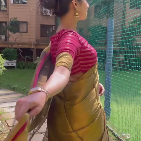 Mayura tissue saree is a classic and can be styled in multiple ways! Style it for a casual event or pair it with heavy jewellery for an intimate event. You can also opt for contrasting blouse to make a statement!
