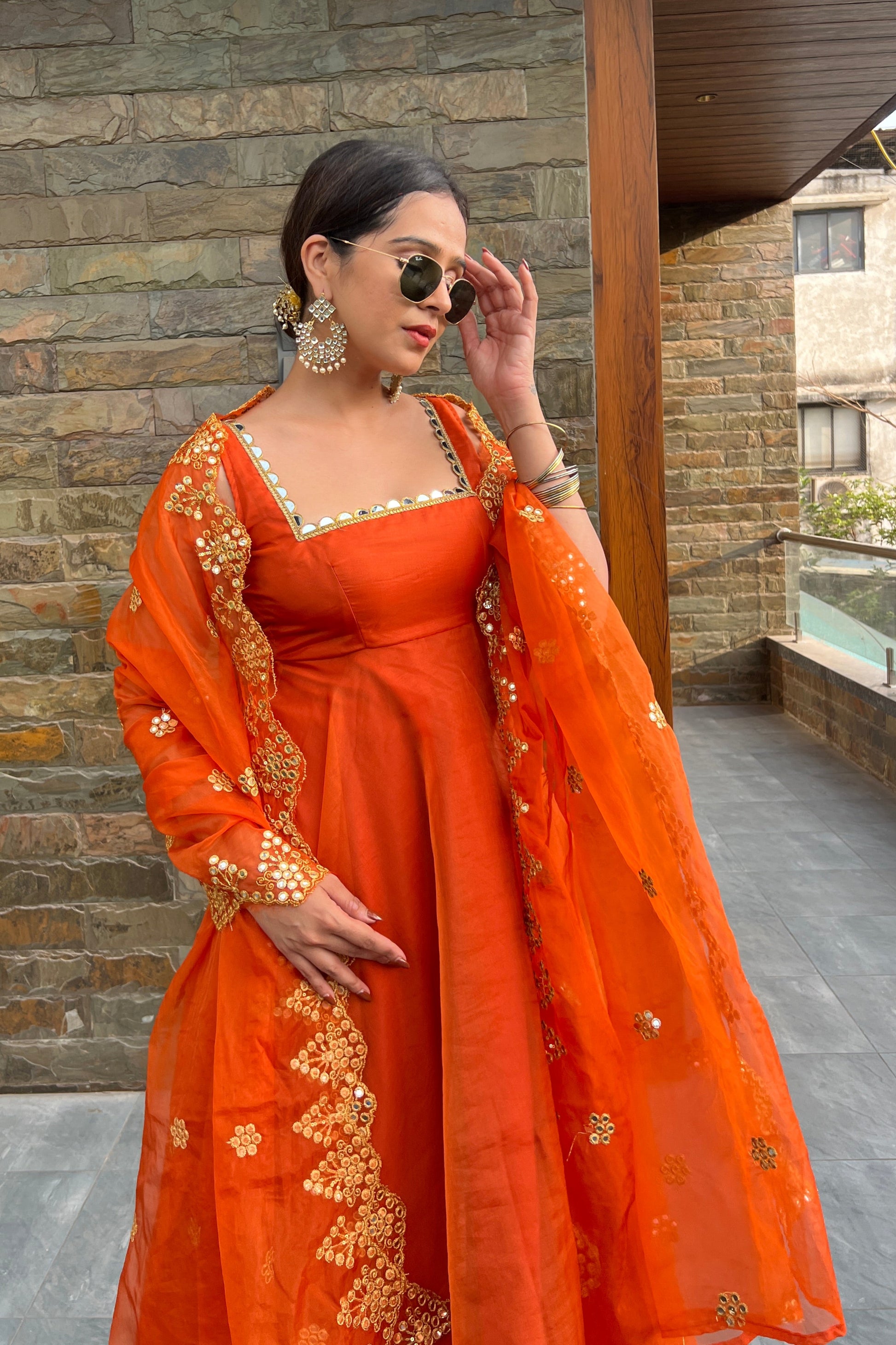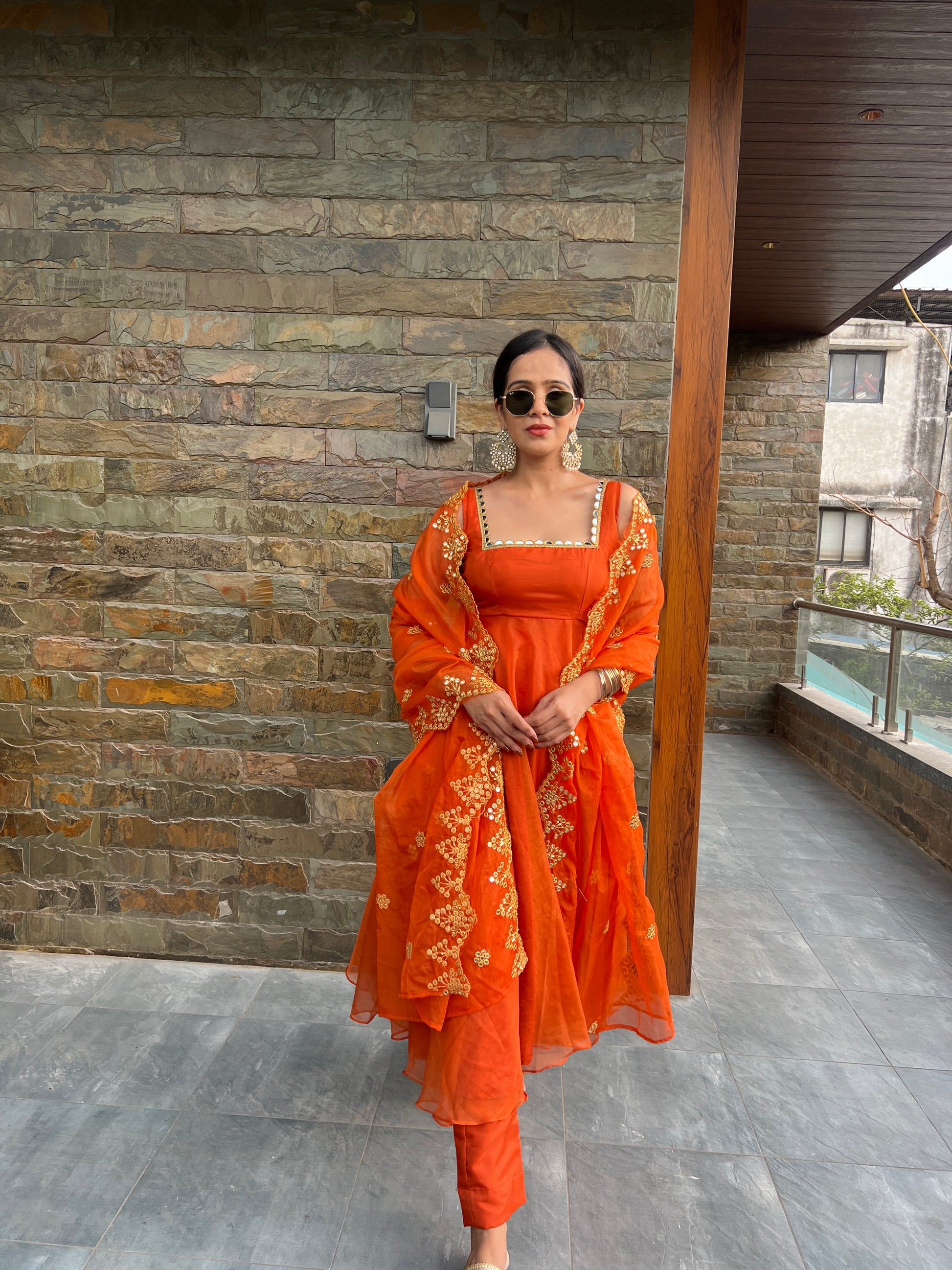 The centerpiece of this set is the stunning flared organza kurta. This luxurious fabric drapes like a dream around your form, creating a silhouette that flows with every movement. The flared silhouette adds a touch of drama and elegance, making you feel like a captivating dancer with every step. The kurta is adorned with exquisite mirror work detailing around the neckline. These delicate mirrors catch the light, adding a touch of captivating sparkle and reflecting your inner radiance.
