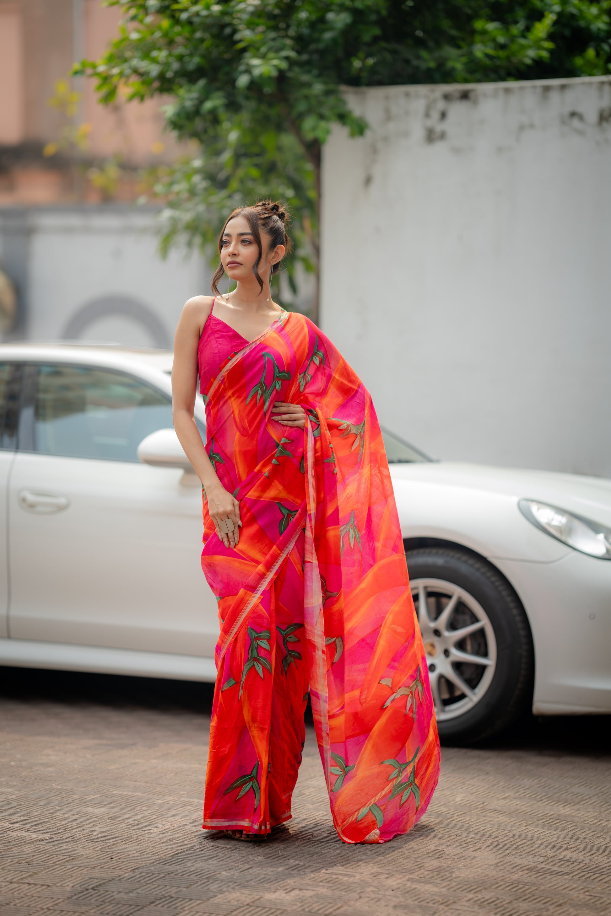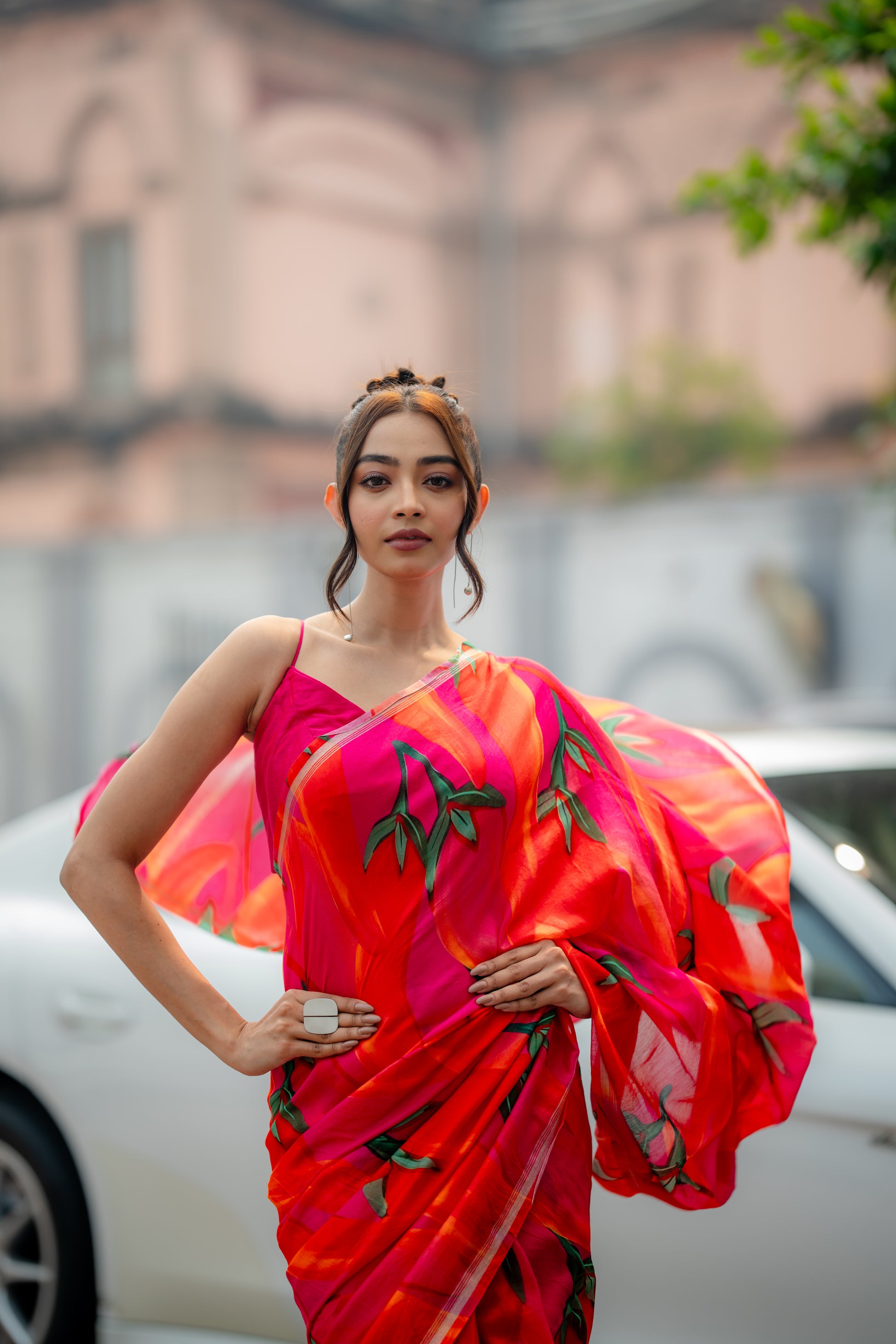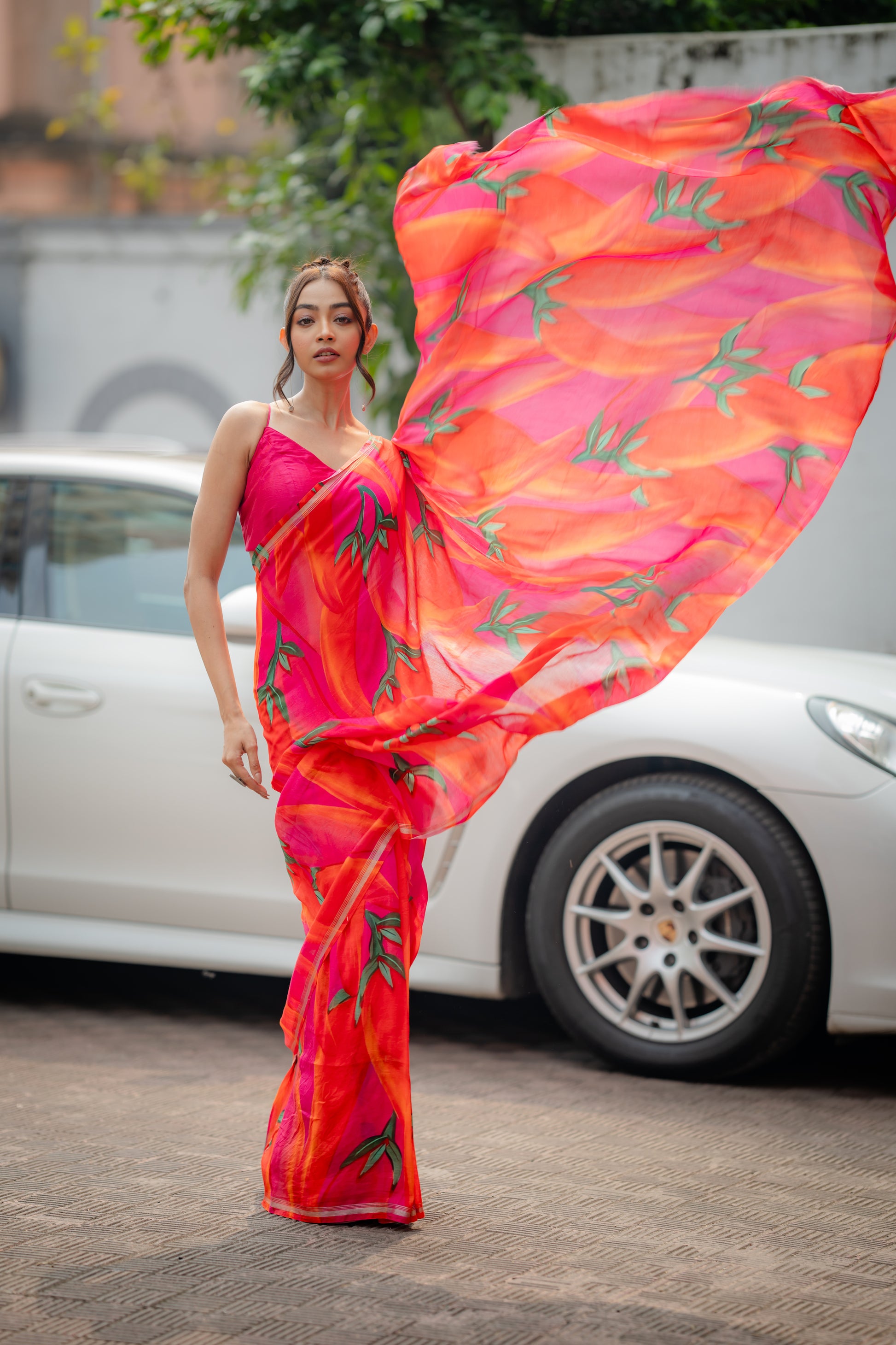 “Mirchi Madness” is a fiery and spirited creation that ignites the senses with its bold design and vibrant colors. Crafted on exquisite chanderi fabric, this saree features playful prints of mirchis or chilis. The fiery pinks, vibrant oranges, and deep greens of the chili prints evoke intense flavors and aromas of spicy cuisine, making it the perfect companion for seaside vacations where indulging in zesty dishes is a must.