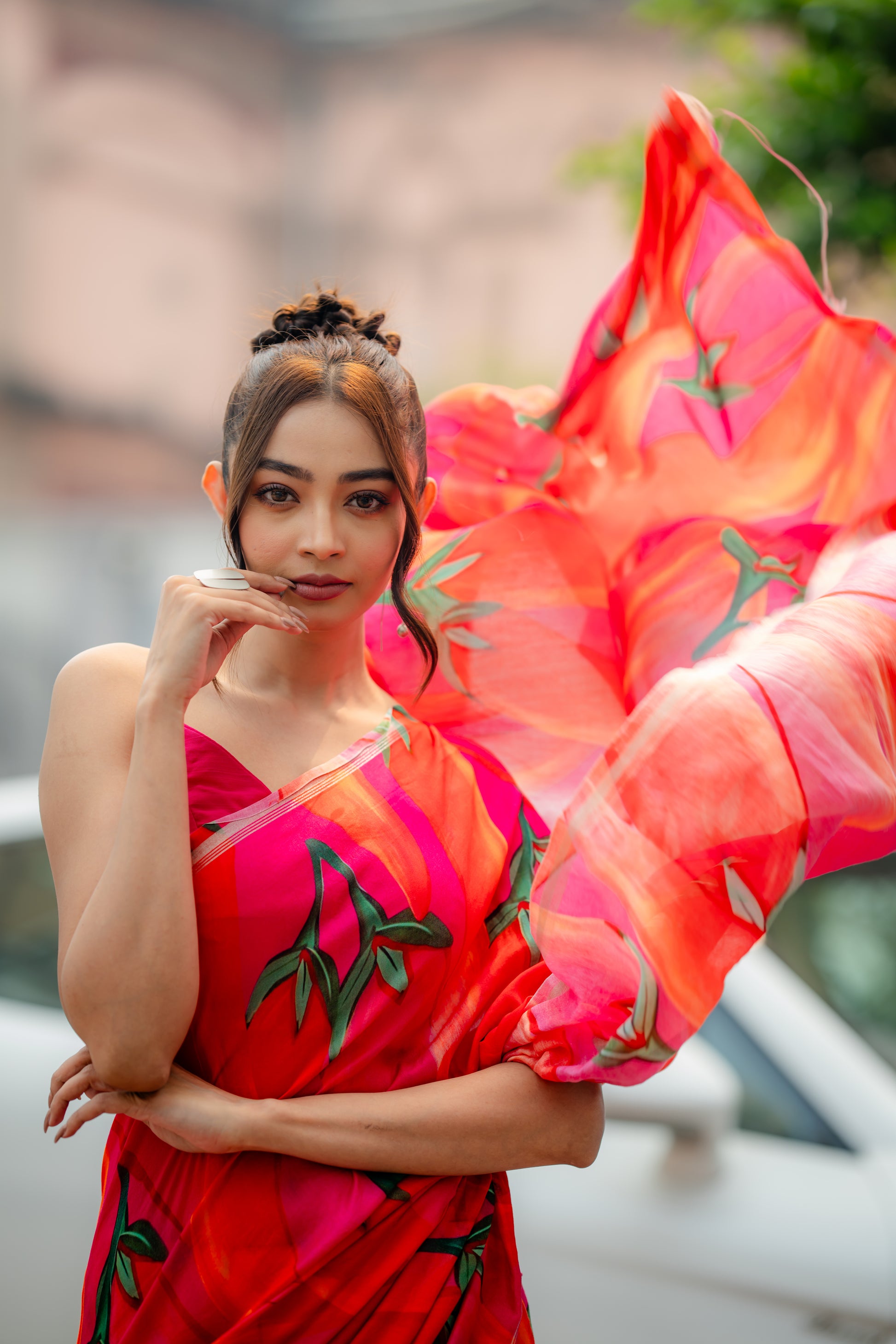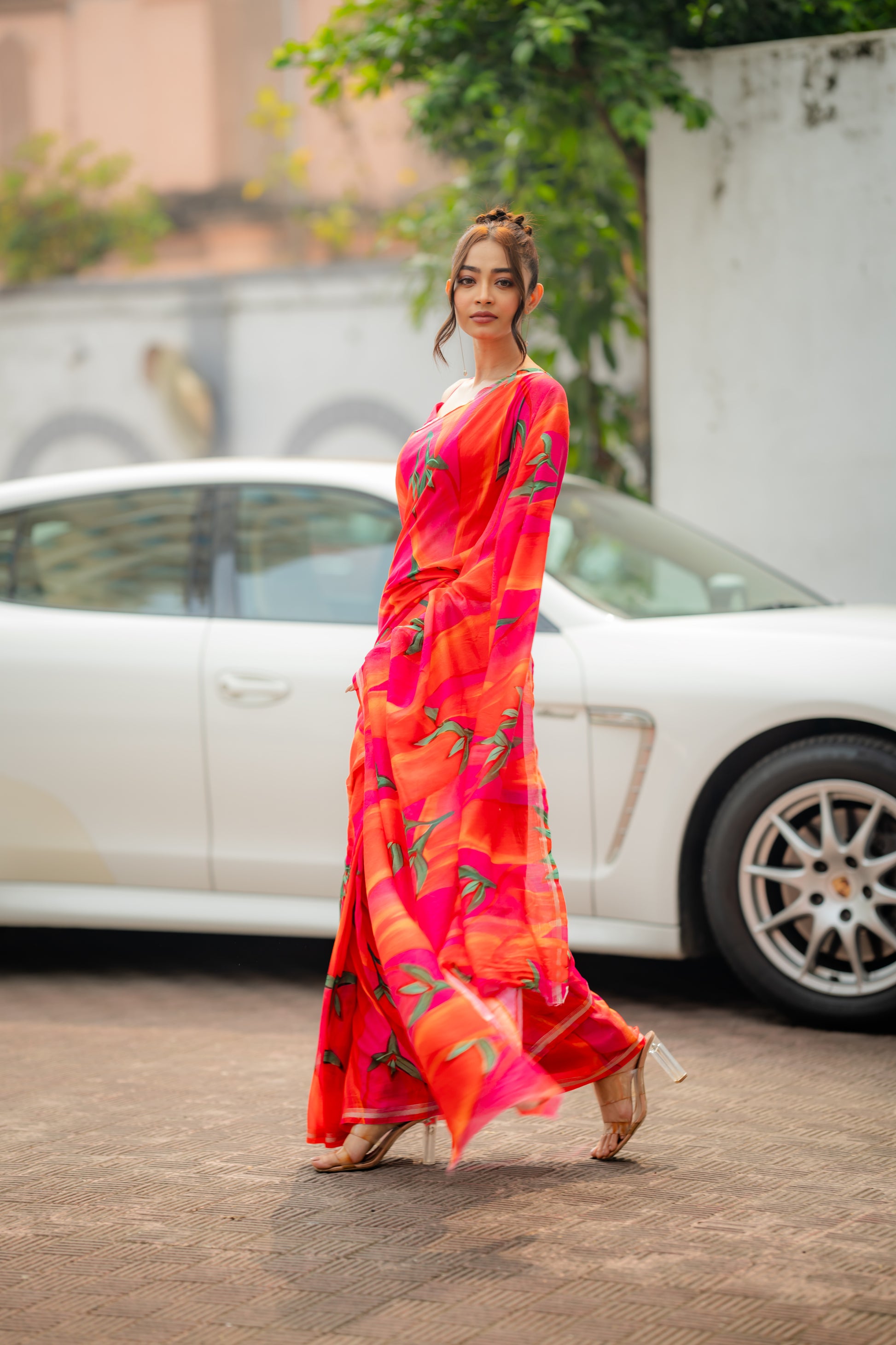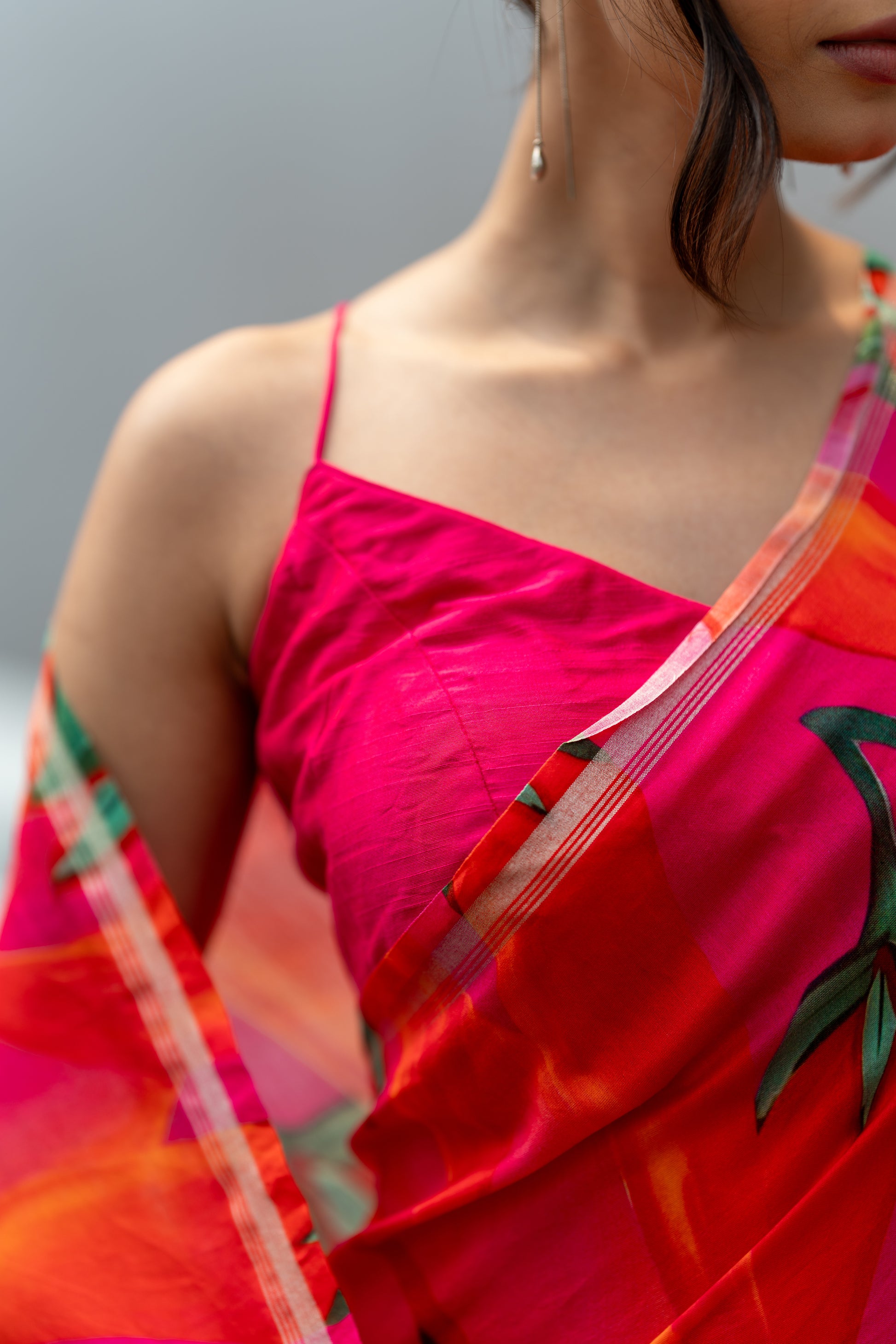 “Mirchi Madness” is a fiery and spirited creation that ignites the senses with its bold design and vibrant colors. Crafted on exquisite chanderi fabric, this saree features playful prints of mirchis or chilis. The fiery pinks, vibrant oranges, and deep greens of the chili prints evoke intense flavors and aromas of spicy cuisine, making it the perfect companion for seaside vacations where indulging in zesty dishes is a must.