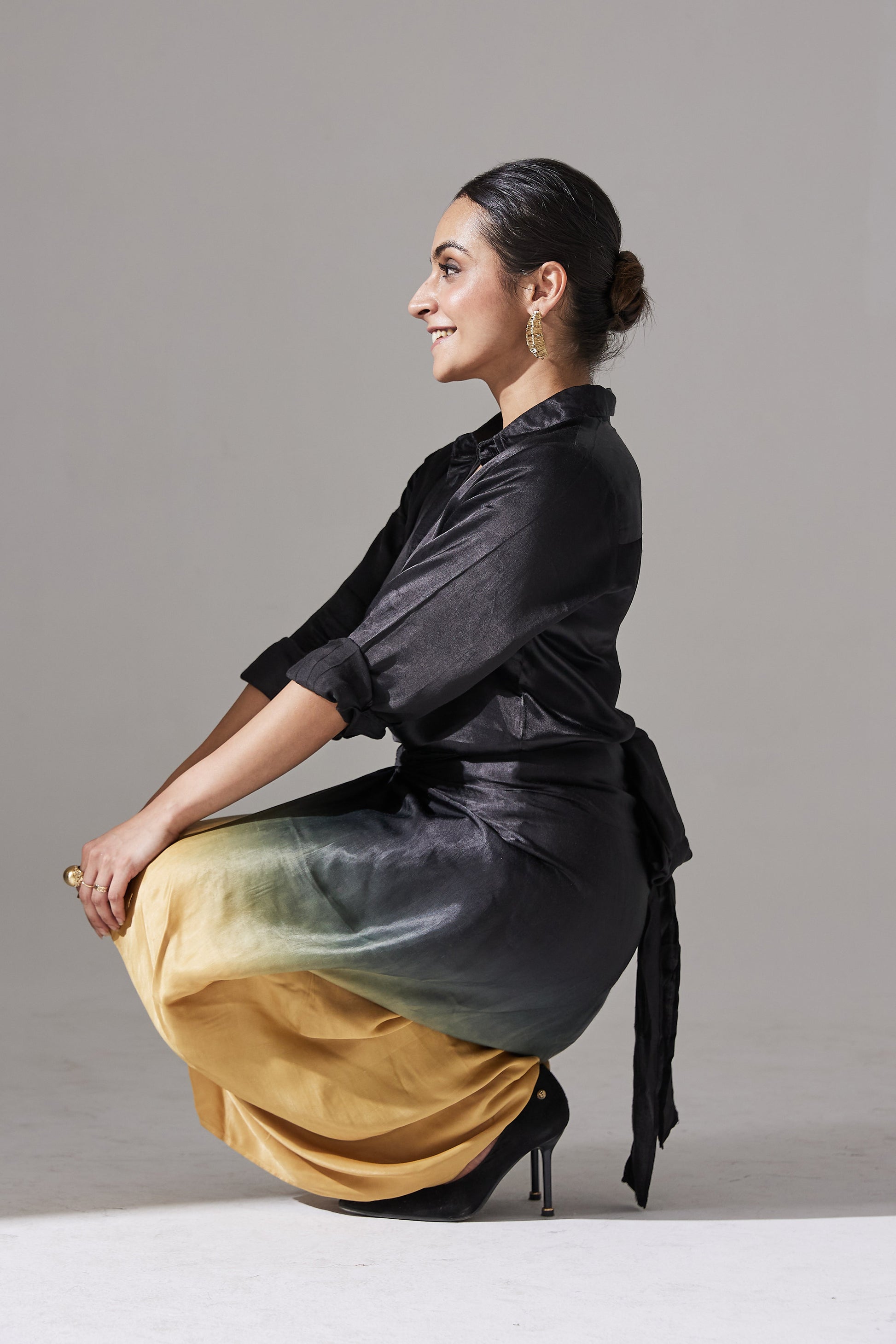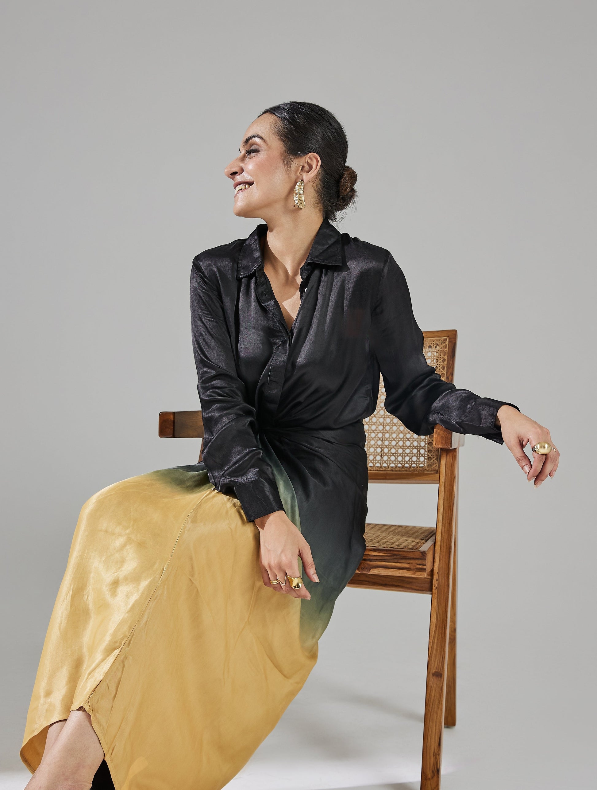 Embrace vibrant summer style with the stunning Nova co-ord set. The full-sleeves shirt pairs beautifully with a wrap-around skirt that hugs your body perfectly, creating a flattering silhouette. The smooth ombre effect from black to gold adds a bold and elegant touch to your look. Made from breathable fabric, this set ensures comfort and easy movement, keeping you cool and stylish throughout the season.