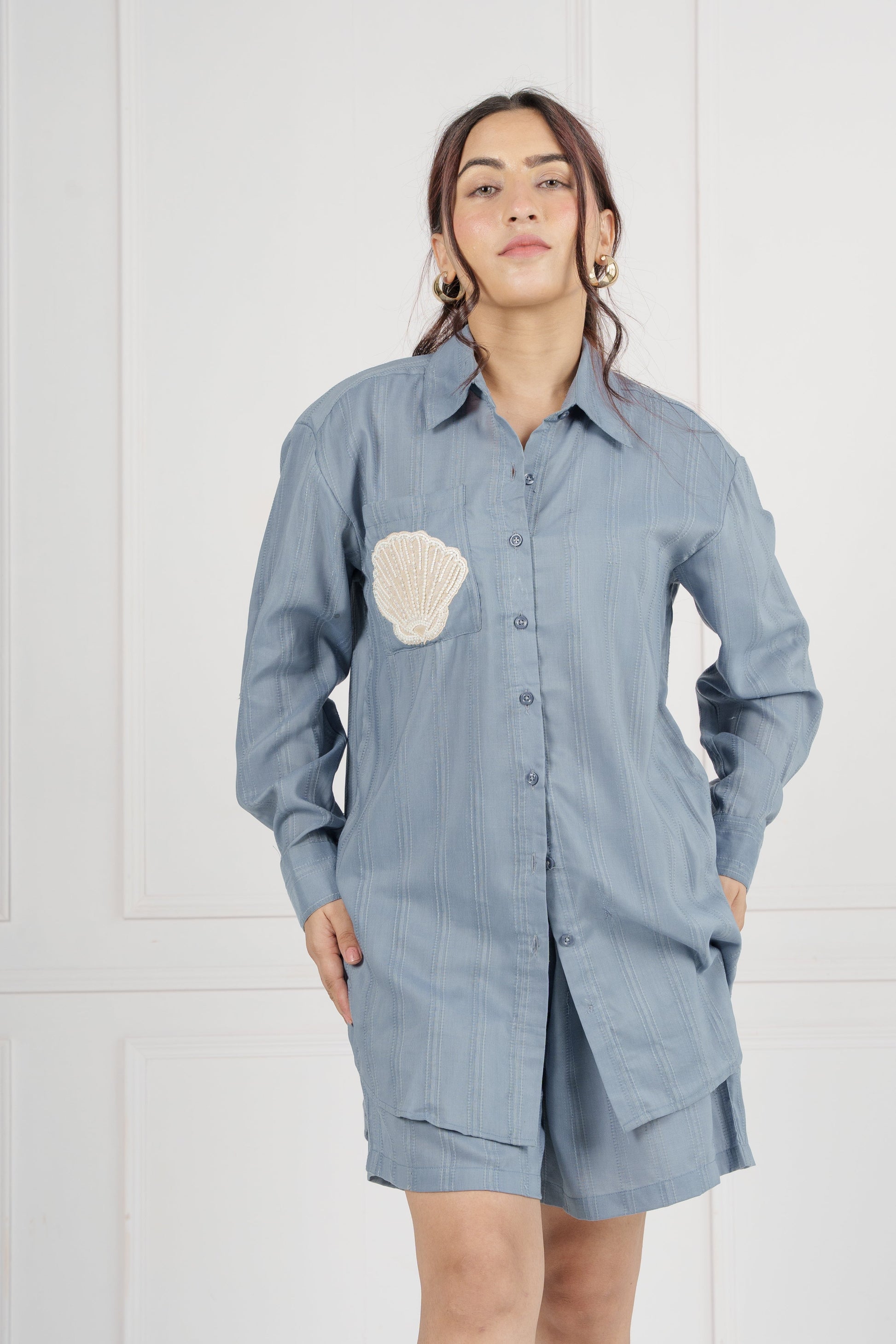 Get ready for your next vacation with the Seashell Coord Set, an ideal blend of comfort and style. This set includes a shirt and shorts, both crafted from soft, breathable cotton fabric to keep you cool and comfortable in any climate. The standout feature is the hand-embroidered shell patch, meticulously hand-stitched onto the pocket, adding a unique and charming touch.
