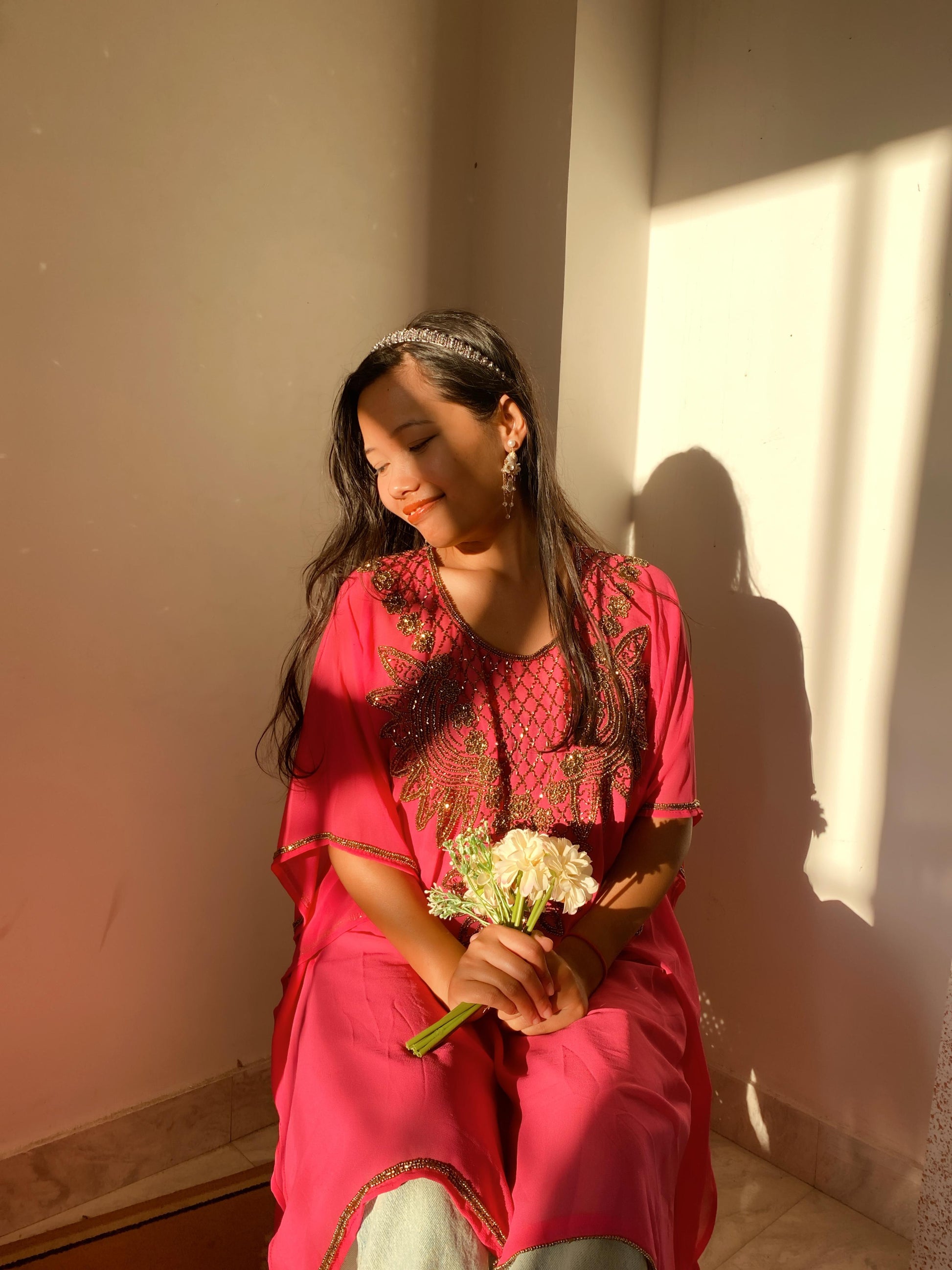 Elevate your wardrobe with this luxurious Kaftan. Crafted from soft, flowy georgette fabric, it offers a flattering fit and effortless elegance. The intricate embroidery adds a touch of sophistication, making it perfect for both casual outings and special occasions.