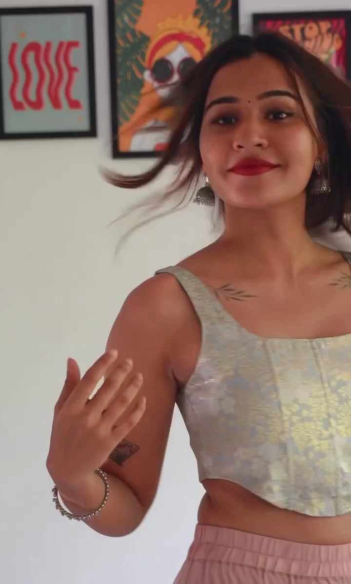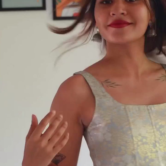 The Tara Banaras Silk Corset is a stunning fusion of elegance and timeless craftsmanship, designed to celebrate the opulence of Banarasi silk in a modern silhouette. This corset features a structured fit that beautifully contours the body for a comfortable, flattering shape.